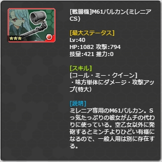 | M61バルカン(ミレニアCS) | ミレニアの髪飾りx120 怪盗ミレニア討伐証x70 リペアチップF(L)x3 | 2 |
