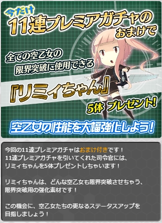 11連プレミアガチャのおまけとして、空乙女の限界突破に使用できるリミィちゃんが5体プレゼントされる。
