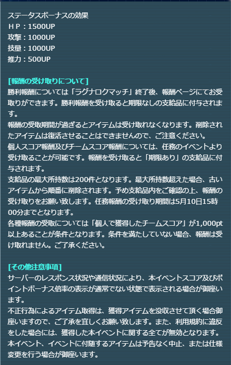 | VSユイチーム-Normal 〔戦戦援援〕 | 15 | 200 | 10 | 15 | 60 | 300 | VG x 0 | 推力xxで全敵から先制可 全敵から先制可能な推力:xx~xx |