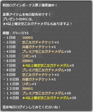 第4弾開催期間 2016/08/01~ 継続ログインボーナスとして第2弾と同アイテムが配布されているが、期間等はアナウンスが無いため詳細不明 第2弾と第3弾の期間から推測するに、15日区切りで更新される模様。(1月で★4メダル30枚とプレミア空乙女ガチャメダルが60枚手に入る計算)