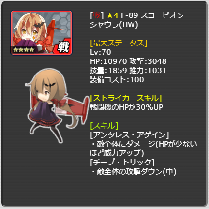 | ハッピーハロウィン計画-前編4 〔戦攻爆援〕 | 8 | 300 | 8 | 12 | 40 | 130 | G x 0 | 推力xxで全敵から先制可 全敵から先制可能な推力:xx~xx |
