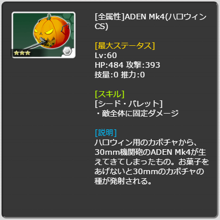 | ハッピーハロウィン計画-前編3 〔戦攻〕 | 7 | 300 | 8 | 12 | 40 | 110 | G x 0 | 推力xxで全敵から先制可 全敵から先制可能な推力:xx~xx |
